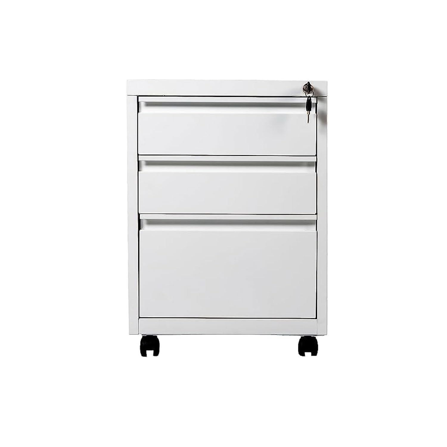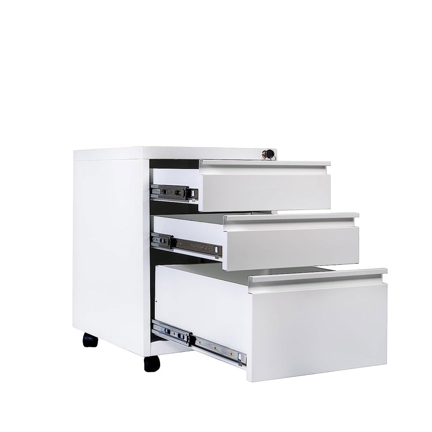 One key lock in all three drawers keeps your business private